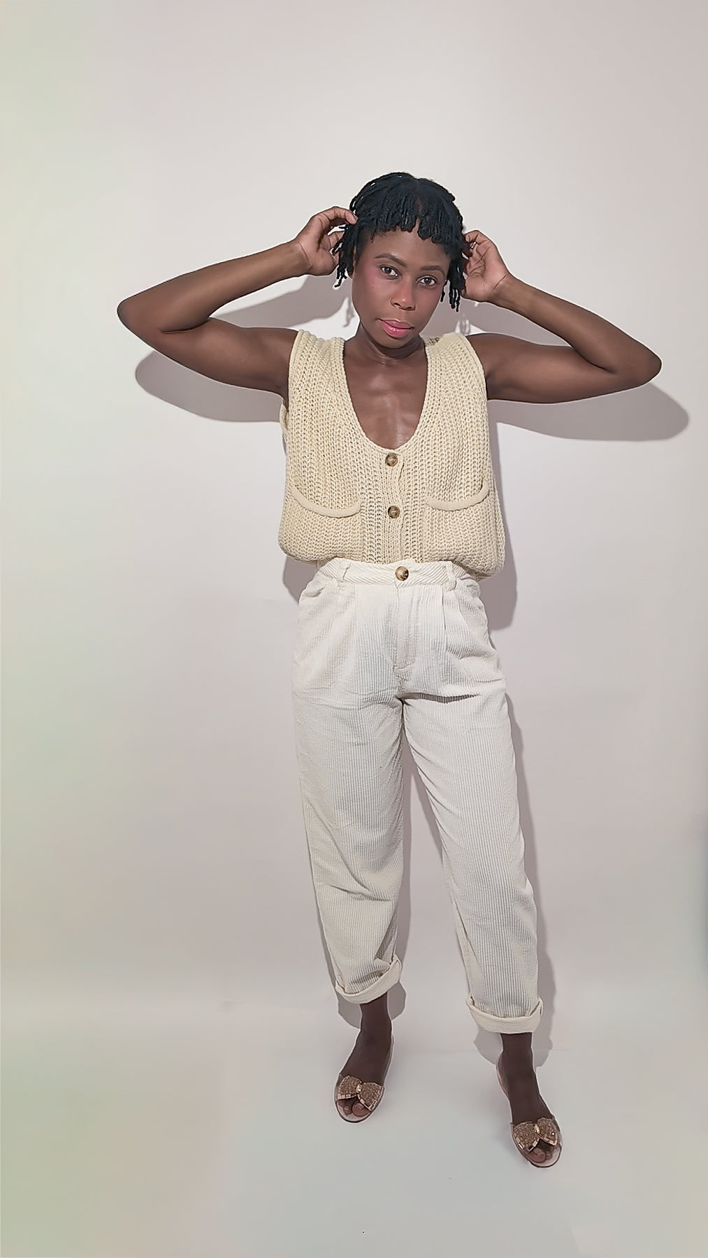 Part of a two-piece corduroy pant and knit vest set – wear together or style separately for versatility